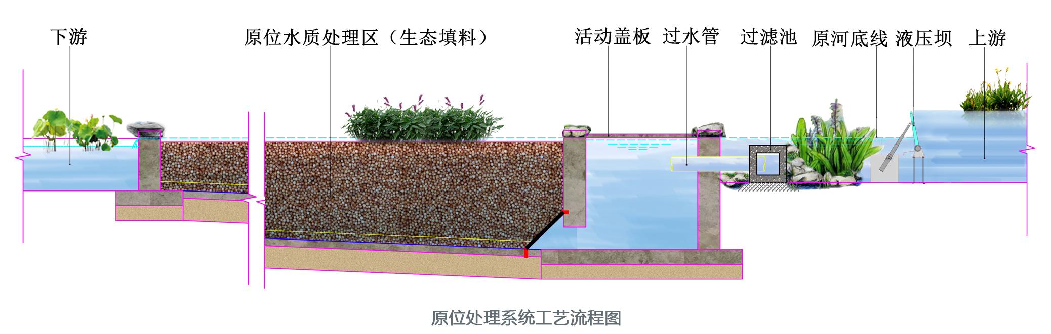 主要利用河道的河床,在河床下建設處理單元。在不降低行洪標準的前提下,通過自動控制的壩體調整河道水位高差,將污染水引入水下處理單元,采用具有針對性的脫氮除磷強化填料做基質,對水質進行凈化。用于周邊土地資源緊張的城市河道治理。